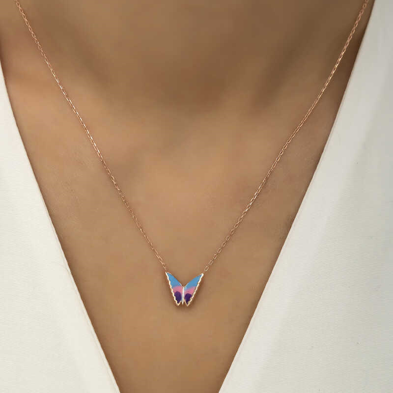 Silver Rose Minimal Butterfly Women's Necklace Butterflies, symbolizing freedom, innocence, and purity, are the expression of pure love and affection. The spring butterfly necklace symbolizes how love begins with a small spark, then grows with great patience, and finally, a declaration of love. A minimal butterfly women's necklace that you and your loved ones will enjoy wearing will be one of the most beautiful gifts. The necklace is made of 925 sterling silver. Rose plating is applied to the silver. Rose-plated silver women's necklaces preserve their shine for a long time and delay oxidation. The colors on the necklace are enamel work. The average silver chain length is 45 cm. Like all silver women's necklaces, the silver minimal butterfly women's necklace is also handmade. Due to silver and precious stones, there may be a ± 10% deviation in the specified product weight. Width: 1.20 cm Length: 1.10 cm Average Weight: 1.65 gr.