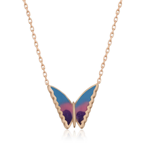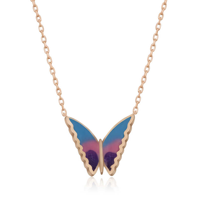 Silver Rose Minimal Butterfly Women's Necklace Butterflies, symbolizing freedom, innocence, and purity, are the expression of pure love and affection. The spring butterfly necklace symbolizes how love begins with a small spark, then grows with great patience, and finally, a declaration of love. A minimal butterfly women's necklace that you and your loved ones will enjoy wearing will be one of the most beautiful gifts. The necklace is made of 925 sterling silver. Rose plating is applied to the silver. Rose-plated silver women's necklaces preserve their shine for a long time and delay oxidation. The colors on the necklace are enamel work. The average silver chain length is 45 cm. Like all silver women's necklaces, the silver minimal butterfly women's necklace is also handmade. Due to silver and precious stones, there may be a ± 10% deviation in the specified product weight. Width: 1.20 cm Length: 1.10 cm Average Weight: 1.65 gr.
