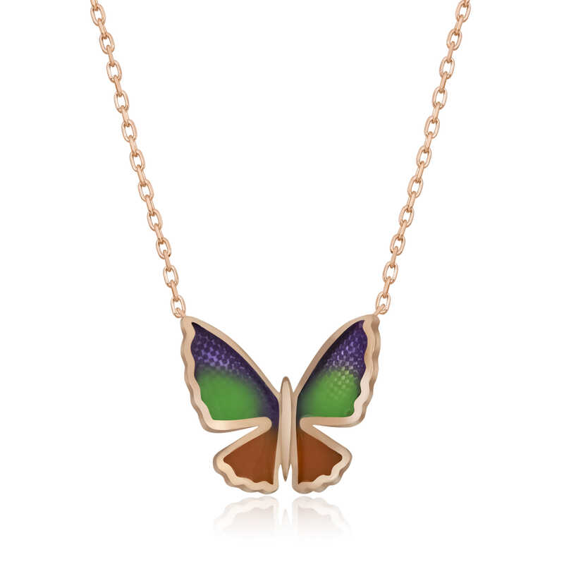 Silver Rose Minimal Butterfly Women's Necklace Butterflies, symbolizing freedom, innocence, and purity, are the expression of pure love and affection. The spring butterfly necklace symbolizes how love begins with a small spark, then grows with great patience, and finally, a declaration of love. A minimal butterfly women's necklace that you and your loved ones will enjoy wearing will be one of the most beautiful gifts. The necklace is made of 925 sterling silver. Rose plating is applied to the silver. Rose-plated silver women's necklaces preserve their shine for a long time and delay oxidation. The colors on the necklace are enamel work. The average silver chain length is 45 cm. Like all silver women's necklaces, the silver minimal butterfly women's necklace is also handmade. Due to silver and precious stones, there may be a ± 10% deviation in the specified product weight. Width: 1.20 cm Length: 1.10 cm Average Weight: 1.81 gr.