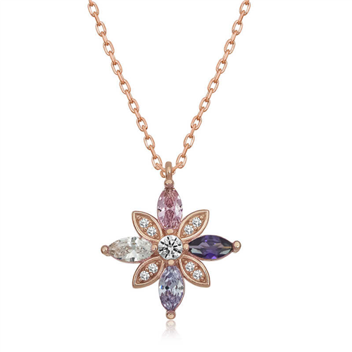 Silver Rose Mix Stone Hope Flower Necklace The hope flower necklace can be a great gift option that symbolizes hope for your best friend, loved one or those closest to you. It is a perfect option for a birthday gift, Valentine's Day gift or on special occasions. Silver mix stone hope flower women's necklace is made of 925 sterling silver. This necklace has rose plating. Rose plated silver women's necklace models preserve their shine for a long time. As with all our silver women's necklace models, the silver mix hope flower women's necklace model is produced by hand. Due to silver and precious stones, there may be ± 10% deviation from the average product weight. Length: 1.90 cm Width: 1.70 cm Avg. Weight: 3.30 gr. Chain Length: 45.00 cm
