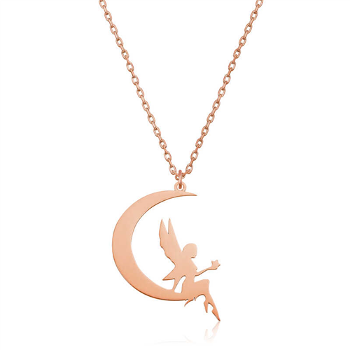 Silver Rose Moon Sitting Water Nymph Necklace The water fairy symbolizes the most beautiful wishes, luck, goodness, and hope. The moon sitting water fairy necklace symbolizes many desires from love to abundance. Fairy and angel necklace designs are among the most preferred forms in the jewelry industry. These necklaces that you can make happy by gifting them to your loved ones on special occasions will strengthen the bond between you with their sparkling looks. The necklace models that you will always carry in your daily life have designs that will showcase your strong stance and keep you up to date with fashion. The necklace is made of 925 sterling silver. The silver is rose plated. Like other necklaces, the silver moon sitting water fairy necklace is produced by hand. Due to silver and precious stones, there may be a ± 10% deviation in the average product weight. Width: 2.00 cm Length: 2.80 cm Average Weight: 3.00 gr. Chain Length: 45.00 cm