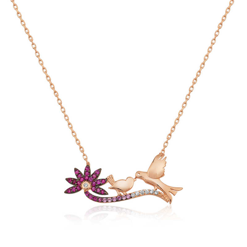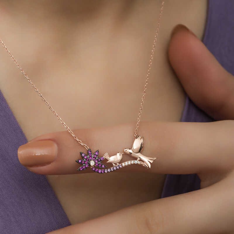 Silver Rose Mother and Baby Bird Women's Necklace It is a special design that represents the love between mother and child. One of the most suitable gifts you can buy to show your devotion to your mother will be this mother and baby bird women's necklace. This specially designed mother and baby bird women's necklace for your mother is made of 925 sterling silver. Rose plated silver. Rose plated silver mother and baby bird women's necklace models preserve their shine for a long time and oxidation is delayed. The stones on the necklace are zircon. The average silver chain length is 45 cm. Silver mother and baby bird women's necklace is handmade. Due to silver and precious stones, there may be a ± 10% deviation in the average product weight. Width: 3.00 cm Length: 0.70 cm Average Weight: 2.10 gr