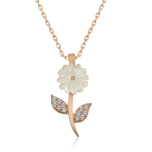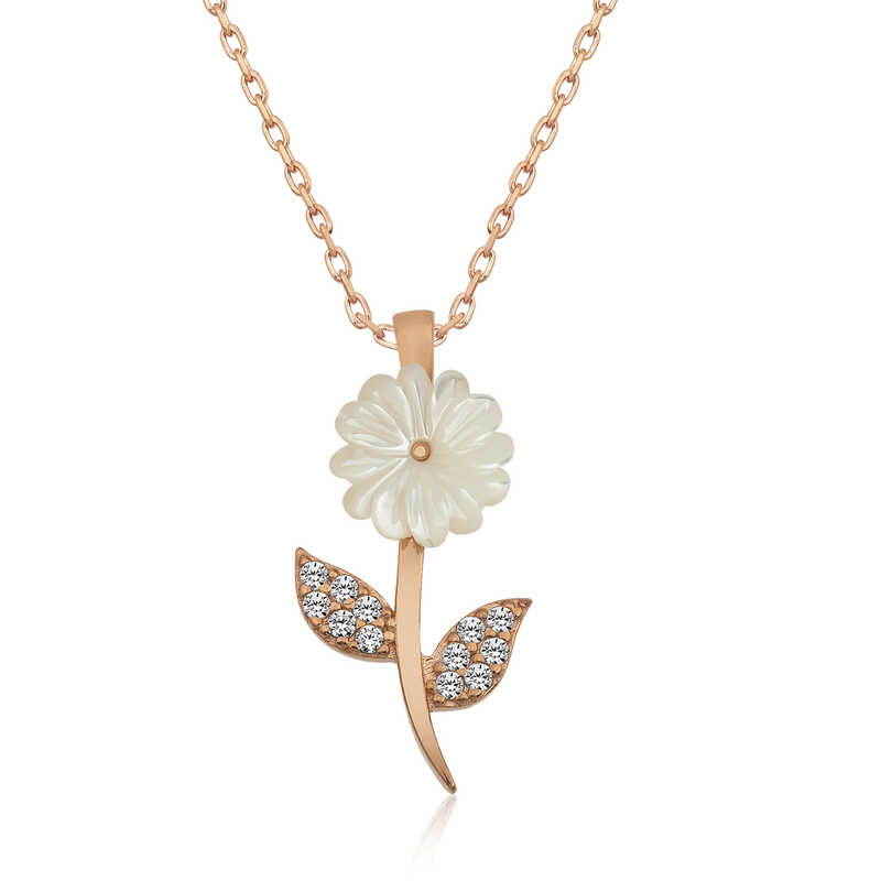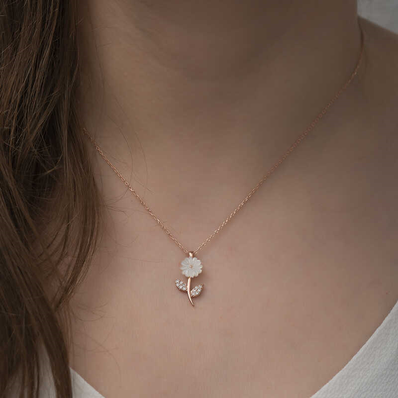 Silver Rose Mother-of-Pearl Flower Necklace You may want to send different gifts and flowers to your loved ones on their special days. You can also make your loved ones happy by making timeless surprises. Inspired by the countless varieties of flowers in nature, this mother-of-pearl flower necklace is a lovely accessory that you can gift to your loved ones. This stylish necklace is a perfect option for a birthday gift, Valentine's Day or special occasions. The necklace is made of 925 sterling silver. Rose plating is applied to silver. Rose plating gives the silver a pink copper color. Like other necklaces, the silver mother-of-pearl flower necklace is produced by hand. Due to silver and precious stones, there may be a ± 10% deviation in the average product weight. Width: 1.00 cm Length: 2.00 cm Average Weight: 2.00 gr.