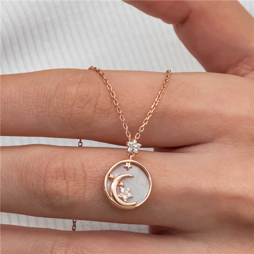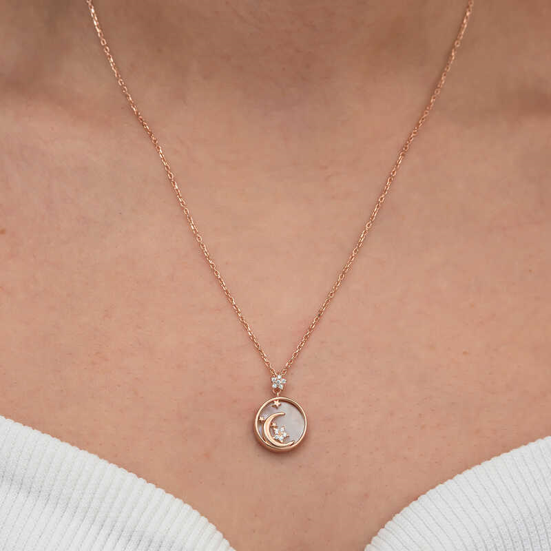 Silver Rose Mother-of-Pearl Stone Crescent Star Crescent Women's Necklace This unique silver mother-of-pearl stone crescent star crescent women's necklace will add elegance to your style with its elegant design and meaningful symbols. This necklace, which presents traditional Turkish motifs with a modern touch, is a perfect accessory that you can use both daily and special occasions. Rose plated silver. Rose plated necklaces preserve their shine for a long time and oxidation is delayed. Due to silver and precious stones, there may be ± 10% deviation in the average product weight. Width: 1.00 cm Length: 1.50 cm Avg. Weight: 2.50 gr. Chain Length: 45.00 cm