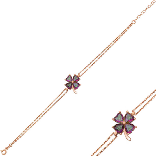 Silver Rose Mystic Topaz Clover Bracelet Topaz, with its dazzling, sparkling, glassy appearance, is a rare gemstone. For this reason, colorless topaz can be confused with diamond. It comes in different colors, including colorless, white, gray, dull blue, yellow, red, and more. Mystic topaz is more effective on people with the zodiac signs of Leo, Virgo, Scorpio, Sagittarius, and Pisces. Some of its energetic benefits include relieving stress. It creates a sense of calm and peace. It uplifts. By reducing the varying effects of the moon's phases on people, it provides spiritual balance. It aids meditation. It enables the flow of universal energy into the body. It promotes relaxation and well-being. The four-leaf clover is considered a symbol of good luck in all cultures. The first leaf symbolizes hope, the second represents faith, the third represents love, and the fourth leaf represents luck. This fourth leaf is very rare in nature. You can gift this meaningful bracelet that shines brightly to the person you love and care about. All of our products are handmade, and due to precious stones, there may be a ± 10% deviation in product weight. Width: 1.00 cm Length: 1.00 cm Average Weight: 2.25 gr.