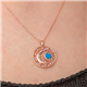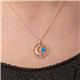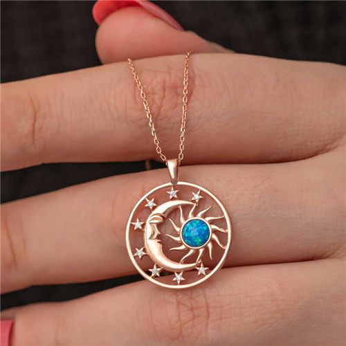 Silver Rose Opal Blue Stone Moon Sun Women's Necklace The sun is the symbol of light, knowledge, goodness, power and management. The moon is an important stone that represents feminine energy. The moon, known to balance female hormones, is also a stabilizer and calmer in general. Because it is also associated with emotions, it is also known as the love stone. This dazzling necklace with its sparkling and different design is made of 925 sterling silver. Rose plated silver. Rose plated silver products preserve their shine for a long time and oxidation is delayed. Like all silver necklaces, the opal blue stone moon sun women's necklace is entirely handmade. Due to silver and precious stones, there may be a ± 10% deviation in the average product weight. Necklace Diameter: 2.00 cm Average Weight: 2.30 gr.