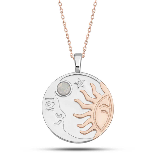 Silver Rose Opal White Stone Moon Sun Women's Necklace The sun is the symbol of light, knowledge, goodness, power and management. The moon is an important stone that represents feminine energy. The moon, known to balance female hormones, is also a stabilizer and calmer in general. Because it is also associated with emotions, it is also known as the love stone. This dazzling necklace with its sparkling and different design is made of 925 sterling silver. Rose and rhodium plated on the silver. Rose and rhodium plated silver products preserve their shine for a long time and oxidation is delayed. Like all silver necklaces, the opal white stone moon sun women's necklace is entirely handmade. Due to silver and precious stones, there may be a ± 10% deviation in the average product weight. Width: 1.80 cm Length: 2.20 cm Average Weight: 2.70 gr.