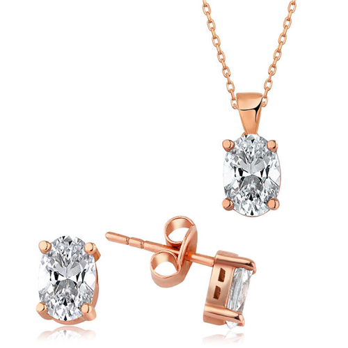 Silver Rose Oval Stone Set of TwoWouldn't you like to buy the most special gift that will suit and symbolize your love? Rose plated oval earrings and necklace are a stylish product that can be used easily in daily life with its minimal design. This set, which highlights feminine refinement with its simple elegant design, is waiting for you. Rose plated on silver. Rose plated silver women's set models preserve their shine for a long time and oxidation is delayed. The stones on the silver set model are zircon. The average length of the silver chain is 45 cm. Silver rose oval stone set is handmade. There may be ± 10% deviation in the specified product weight due to silver and precious stones.Width: 0.50 cmLength: 0.70 cmAvg. Weight: 3.50 gr.