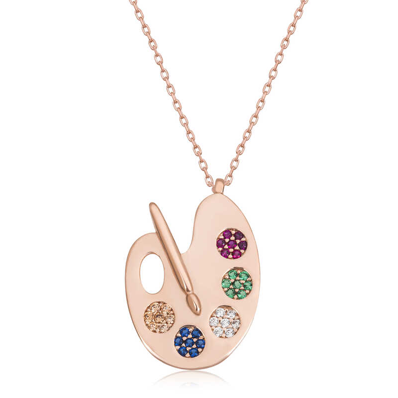 Silver Rose Painter's Palette Women's Necklace How about reflecting your own colors with this painter's palette, which embodies all the colors of life and allows you to use all your imagination? This stylish and distinctive design is a perfect option for a birthday gift, a Valentine's Day gift or a gift for mothers on special occasions. This meaningful and stylish necklace is made of 925 sterling silver. This women's silver necklace is rose plated. All necklace models with rose plating preserve their shine for a long time, turn the silver into a pink color and delay oxidation. The average chain length is 45 cm. Like all women's silver necklace models, this silver painter's palette women's necklace is also handmade. Due to silver and precious stones, there may be a ± 10% deviation in product weight. Width: 1.60 cm Length: 2.30 cm Average Weight: 2.30 gr