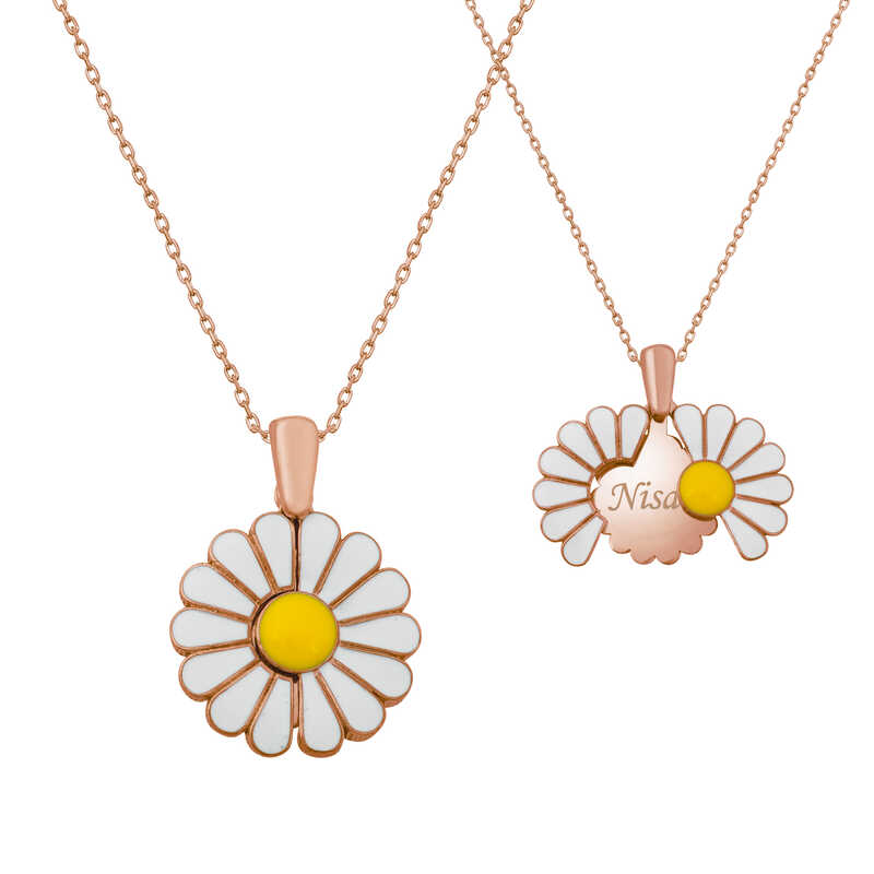 Silver Rose Personalized Daisy Necklace Daisy flower expresses the meaning of pure love. One of its most important features is that there is one on each stem. This stylish necklace, inspired by fortune telling about "loves you", "loves you", is waiting for you. A personalized daisy necklace is a perfect option for a birthday gift, Valentine's Day gift or a gift for mothers on special occasions. The silver daisy personalized women's necklace is made of 925 sterling silver. This necklace has rose plating. Rose-plated silver women's necklace models preserve their shine for a long time and delays the tarnishing of the silver. As with all our silver women's necklace models, the silver personalized daisy women's necklace model is produced by hand. Due to silver and precious stones, there may be a ± 10% deviation in the average product weight. Width: 1.50 cm Length: 1.50 cm Avg. Weight: 3.60 gr.