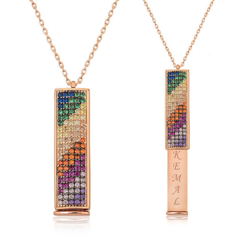Silver Rose Personalized Rainbow Necklace This necklace with a name engraved inside will always remind you of your love and your first moment of happiness for your lover and will accompany your most romantic moments. It is specially designed for lovers. This personalized necklace with a name engraved inside, decorated with colorful stones, will be one of the most meaningful gifts you can give to your loved one with whom you expect a long relationship. This specially designed necklace is made of 925 sterling silver. Rose plated silver. Rose plated silver women's necklace models preserve their shine for a long time, turn the silver to a pink color and delay oxidation. The stones on the necklace are zircon. The average chain length is 45 cm. Due to silver and precious stones, there may be a ± 10% deviation in product weight.Note: Personalized products are not returned. Width: 0.70 cm Length: 2.70 cm Average Weight: 4.32 gr.