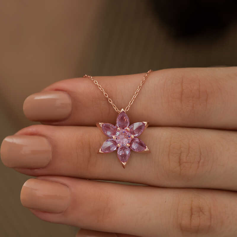 Silver Rose Pink Flower Necklace Why not express your feelings to your loved ones with an elegant floral patterned necklace? This stylish necklace, which is among the gift options that you can send to her on special occasions, is among the best ways to make your loved ones happy. Silver pink flower women's necklace crafted with the highest quality and most sparkling stones is waiting for those who want to express their love once again, for those who want to say "you are a flower." This specially designed silver pink flower women's necklace is made of 925 sterling silver. Rose plating is applied on the silver. Rose-plated silver women's necklace models preserve their shine for a long time and oxidation is delayed. The average silver chain length is 45 cm. Like all women's silver necklace models, the silver pink flower necklace is also handmade. Due to silver and precious stones, there may be a ± 10% deviation in the specified product weight. Width: 1.60 cm Length: 1.60 cm Average Weight: 4.00 gr.