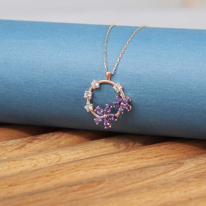 Silver Rose Purple Flower Women's Necklace Why not express your feelings to your loved ones with an elegant floral patterned necklace? This stylish necklace, which is among the gift options that you can send to her on special occasions, is among the best ways to make your loved ones happy. Crafted with the highest quality, brightest, and most sparkling stones, the silver purple flower women's necklace is waiting for those who want to express their love once again, for those who want to say "you are a flower." This specially designed silver purple flower women's necklace is made of 925 sterling silver. Rose plating is applied on the silver. Rose-plated silver women's necklace models preserve their shine for a long time and oxidation is delayed. The average silver chain length is 45 cm. Like all women's silver necklace models, the silver purple flower women's necklace is also handmade. Due to silver and precious stones, there may be a ± 10% deviation in the specified product weight. Width: 2.20 cm Length: 2.30 cm Average Weight: 2.90 gr.