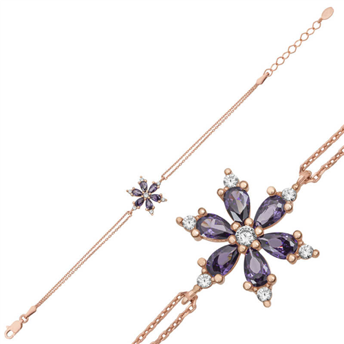 Silver Rose Purple Lotus Flower Women's Bracelet The Lotus Flower is one of the most beautiful flowers that symbolizes spirituality, morality and cleansing. The lotus flower, which blooms in the polluted waters of the rainforests, has managed to become a symbol of beliefs such as Buddhism and Hinduism with its beauty and purity. Moreover, the lotus flower is considered sacred in many ancient civilizations. Another detail that makes the lotus flower special is the region where the flower grows. The lotus flower, which grows especially in swamps and muddy lands, can remain clean despite the dirty environment in which it grows. The lotus flower, which can clean even a single particle of dust that lands on it, greets those who meet it with a pure white beauty. You can gift the Silver Purple Lotus Flower Bracelet, which is considered sacred in different cultures, to your loved ones or you can treat yourself. This stylish Bracelet is a perfect option for a birthday gift, Valentine's Day or on special occasions. Bracelet; Made of 925 sterling silver. The stones on it are zircon. Rose plated silver. Like other bracelets, silver Purple lotus flower bracelets are produced by hand. Due to silver and precious stones, there may be ± 10% deviation from the average product weight. Width: 1.60 cm Length: 2.10 cm Bracelet length: 19 cm Average Weight: 2.30 gr.