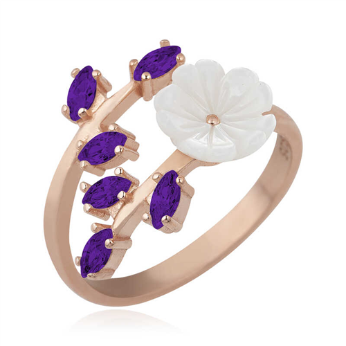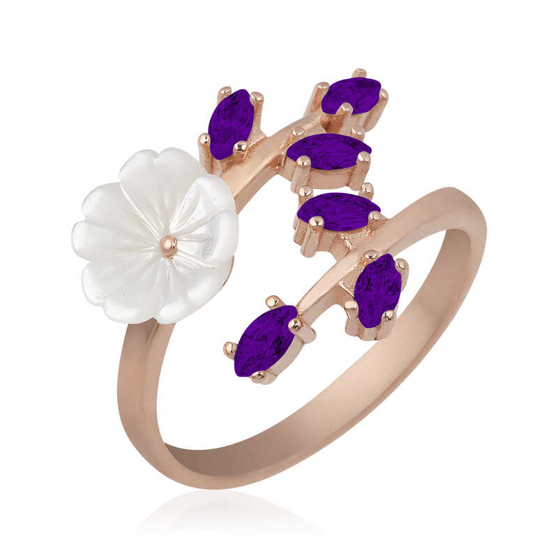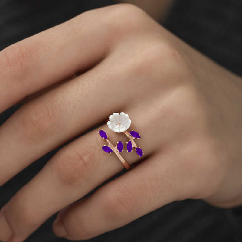 Silver Rose Purple Leaf Spring Flower Ring With the warming of the weather, nature, coming to life, heralds the arrival of spring. Trees covered in green, colorful flowers bloom and welcome us with their unique scents. Inspired by nature, this ring symbolizes the rebirth of spring. This stylish ring is a perfect option for a birthday gift, Valentine's Day or special occasions. The ring is made of 925 sterling silver. Rose plated on the silver. Like other rings, the silver purple leaf spring flower ring is also handmade. Due to silver and precious stones, there may be ± 10% deviation from the average product weight. Width: 2.00 cm Length: 2.00 cm Avg. Weight: 2.38 gr.
