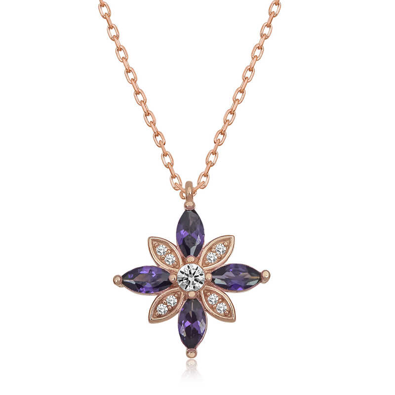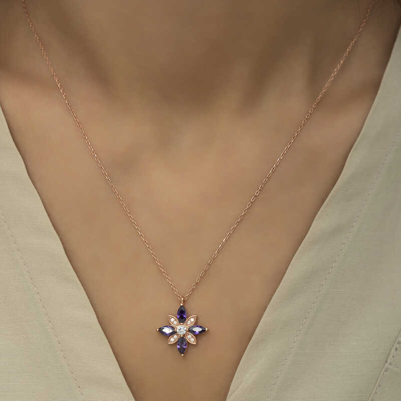 Silver Rose Purple Stone Hope Flower Necklace The hope flower necklace can be a great gift option that symbolizes hope for your best friend, loved one or those closest to you. It is a perfect option for a birthday gift, Valentine's Day gift or on special occasions. Silver purple stone hope flower women's necklace is made of 925 sterling silver. This necklace is rose gold plated. Rose gold plated silver women's necklace models preserve their shine for a long time. As with all our silver women's necklace models, the silver purple hope flower women's necklace model is handmade. Due to silver and precious stones, there may be ± 10% deviation from the average product weight. Length: 1.90 cm Width: 1.70 cm Avg. Weight: 3.30 gr. Chain Length: 45.00 cm