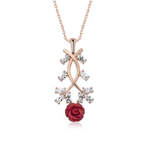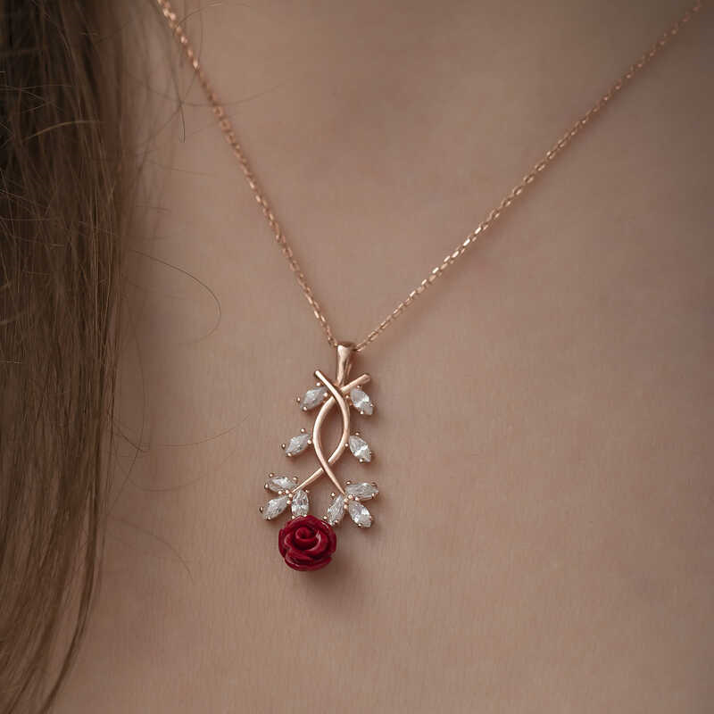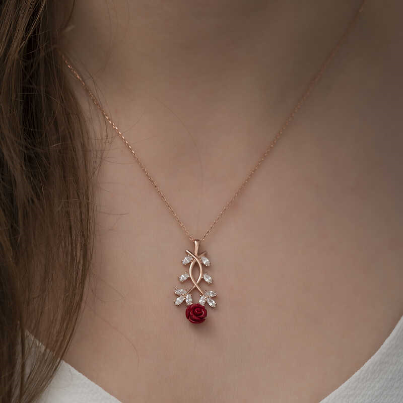 Silver Rose Red Rose Necklace With the warming of the weather, nature, coming to life, heralds the arrival of spring. Trees covered in green, colorful flowers bloom and welcome us with their unique scents. Inspired by nature, this necklace symbolizes the rebirth of spring. This stylish necklace is a perfect option for a birthday gift, Valentine's Day or special occasions. The necklace is made of 925 sterling silver. Rose plated silver. Rose plated products give the silver a pink copper color. Like other necklaces, the silver red rose necklace is produced by hand. Due to silver and precious stones, there may be a ± 10% deviation in the average product weight. Width: 1.50 cm Length: 2.00 cm Average Weight: 3.00 gr.