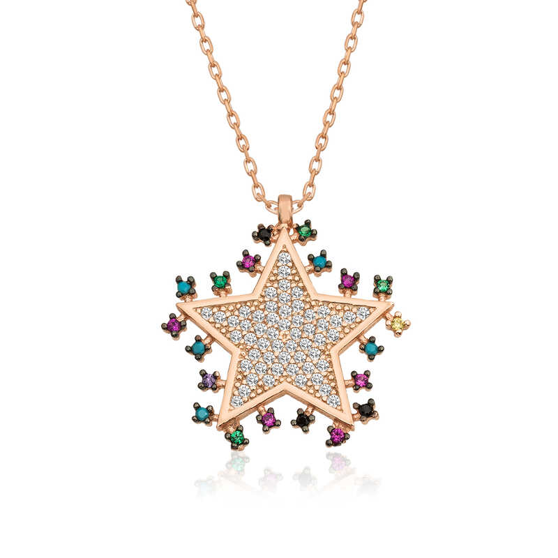 Silver Rose Shining Star Necklace The star is an auspicious symbol believed to bring luck in many societies and teachings. It carries the energy of the Planet Venus. The Planet Venus is also the representative of the energy of love and romance. This stylish necklace consisting of a colorful shining star is a perfect option for a birthday gift, Valentine's Day gift or for special occasions. Silver shining star women's necklace is made of 925 sterling silver. This necklace has rose plating. Rose-plated silver women's necklace models preserve their shine for a long time. As with all our silver women's necklace models, the silver rose shining star women's necklace model is produced by hand. Due to silver and precious stones, there may be a ± 10% deviation in the average product weight. Width: 2.00 cm Length: 2.00 cm Average Weight: 3.00 gr. Chain Length: 45 cm