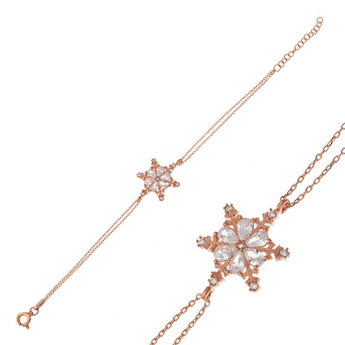 Silver Rose Snow Flower Women's Bracelet The shine and clarity of women are likened to snowflakes. The snowflake also symbolizes the person you love. The fact that each snowflake, like women, is unique and has a different value is another feature that makes them special. The nobility of the snowflake has managed to attract attention in every period. It also symbolizes that people, just like snowflakes, can live happily without hurting each other. This stylish and meaningful bracelet is a perfect option for a birthday gift, Valentine's Day gift or a gift for mothers on special occasions. The bracelet is made of 925 sterling silver. Rose plated on silver. Rose plated products preserve their shine for a long time and oxidation is delayed. Like all silver women's bracelets, this silver snowflake women's bracelet is entirely handmade. Due to silver and precious stones, there may be ± 10% deviation in the average product weight. Snow Flower Width: 1.80 cm Snow Flower Length: 2.50 cm Bracelet Length: 19 cm Average Weight: 2.90 gr.
