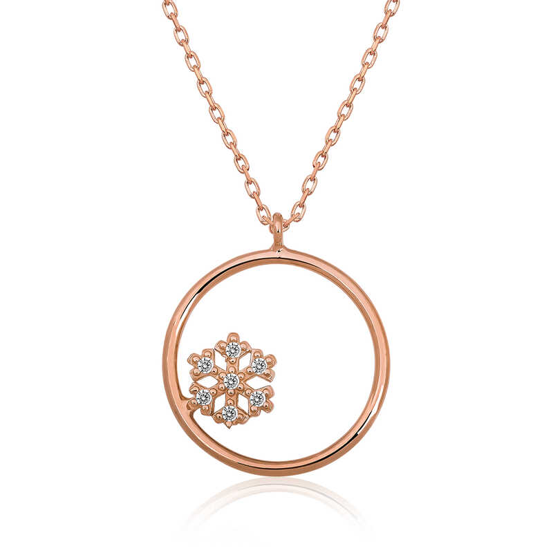 Silver Rose Snowflake Detailed Hoop Necklace The shine and clarity of women are specially designed to resemble snowflakes. The fact that each snowflake is unique and has a different value, just like women, is another feature that makes them special. Their nobility has managed to attract attention in every period. Additionally, it symbolizes that people, just like snowflakes, can live happily without hurting each other. This stylish snowflake loop detailed necklace is a perfect option for special occasions as a birthday gift, Valentine's Day gift or a gift for mothers. The necklace is made of 925 sterling silver. Rose gold plated over silver. Rose gold plated products preserve their shine for a long time, turn the silver to a pink color, and oxidation is delayed. Like all silver women's necklaces, this silver snowflake detailed hoop necklace is entirely handmade. Due to silver and precious stones, there may be a ± 10% deviation in the average product weight. Width: 2.00 cm Length: 2.00 cm Average Weight: 2.20 gr. Chain Length: 45.00 cm