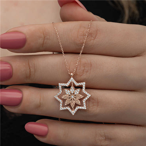 Silver Rose Snowflake Women's Necklace The sparkle and clarity of women are specially designed to resemble snowflakes. The fact that each snowflake is unique and has a different value, like women, is another feature that makes them special. Their nobility has managed to attract attention in every period. In addition, it symbolizes that people, just like snowflakes, can live happily without hurting each other. This stylish necklace is a perfect option for a birthday gift, a Valentine's Day gift or a gift for mothers on special occasions. The necklace is made of 925 sterling silver. Rose plating is applied to the silver. Rose-plated silver women's necklace models preserve their shine for a long time and oxidation is delayed. The average chain length is 45 cm. Like all silver women's necklace models, this silver snowflake women's necklace is also entirely handmade. Due to silver and precious stones, there may be a ± 10% deviation in the average product weight. Width: 2.10 cm Length: 2.40 cm Average weight: 3.10 gr