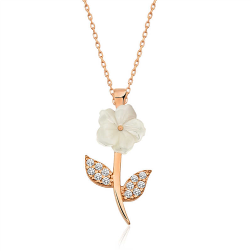 Silver Rose Spring Flower Women's Necklace Why not express your feelings to your loved ones with an elegant floral patterned necklace? This stylish necklace, which is among the gift options that you can send to her on special occasions, is among the best ways to make your loved ones happy. Crafted with the highest quality, brightest, and most sparkling stones, the silver spring flower women's necklace is waiting for those who want to express their love once again, for those who want to say "you are a flower." This specially designed silver spring flower women's necklace is made of 925 sterling silver. Rose gold plated on silver. Rose gold plated silver women's necklace models preserve their shine for a long time and oxidation is delayed. The flower part on the necklace is made of mother-of-pearl and the leaves have zircon stones. The average silver chain length is 45 cm. Like all women's silver necklace models, the silver spring flower women's necklace is also handmade. Due to silver and precious stones, there may be a ± 10% deviation in the specified product weight. Width: 1.00 cm Length: 2.00 cm Average Weight: 2.00 gr.