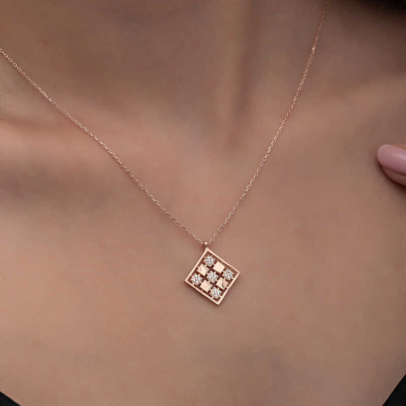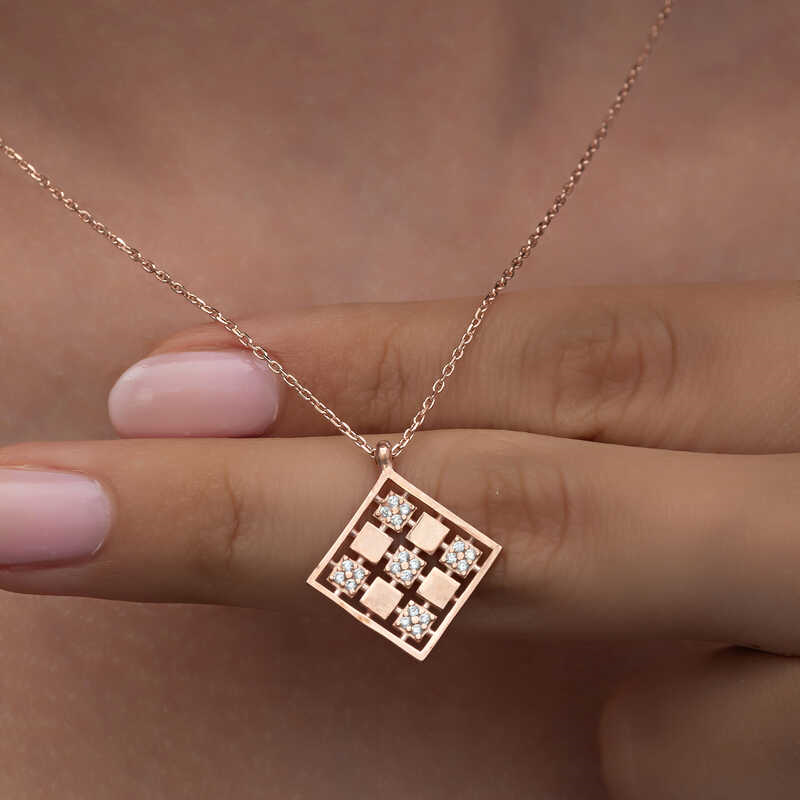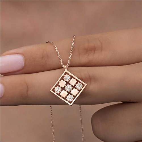 Silver Rose Quadrangular Zircon Stone Women's Necklace This women's necklace model made of zircon stone on silver is a stylish accessory that you can use at any time of the day. You can gift this necklace to yourself or your loved ones on your birthday, Mother's Day or special occasions. The quadrangular zircon stone women's necklace model is made of 925 sterling silver. Rose plated silver. Rose plated silver women's necklace models preserve their shine for a long time. Like all women's necklaces, the silver quadrangular zircon stone women's necklace model is also produced by hand. Due to silver and precious stones, there may be a ± 10% deviation in the average product weight. Width: 1.80 cm Length: 2.10 cm Chain Length: 45 cm Average Weight: 2.50 gr.
