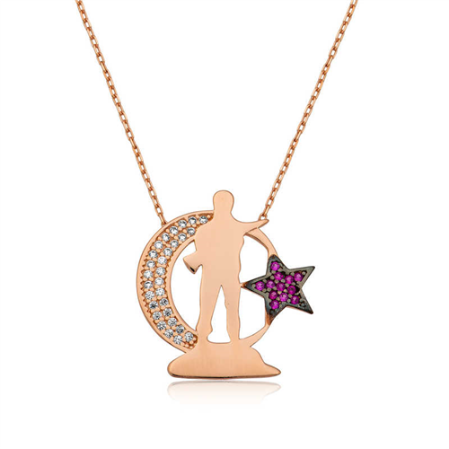 Silver Rose Crescent Star Soldier Women's Necklace This necklace, which features a soldier protecting his country and flag in front of a crescent star, has a spiritual meaning. It is a nice gift for young people or mothers waiting for their military service. This stylish necklace is made of 925 sterling silver. The silver crescent star soldier women's necklace, which you and your loved ones will enjoy wearing, is a perfect option for a birthday gift, Valentine's Day gift or a gift for mothers on special occasions. Rose plating is used on the silver. Rose-plated women's necklace models preserve their shine for a long time, turn the silver to a pink color, and oxidation is delayed. The stone on it is zircon. Like all silver women's necklaces, the silver crescent star soldier women's necklace is also handmade. Due to silver and precious stones, there may be ± 10% deviation in the specified product weight. Width: 2.20 cm Length: 2.20 cm Average Weight: 2.42 gr. Chain Length: 45 cm