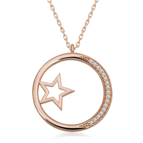 Silver Rose Star Detailed Hoop Women's Necklace The star is an auspicious symbol believed to bring luck in many societies and teachings. It carries the energy of the Planet Venus. The Planet Venus is also the representative of the energy of love and romance. This stylish star necklace made of zircon stones is a perfect option for a birthday gift, Valentine's Day gift or special occasions. Silver rose zircon stone star women's necklace is made of 925 sterling silver. This necklace has rose plating. Rose plated silver women's necklace models preserve their shine for a long time. As with all our silver women's necklace models, the silver rose stone star women's necklace model is produced by hand. Due to silver and precious stones, there may be ± 10% deviation in the average product weight. Width: 2.10 cm Length: 2.30 cm Average Weight: 2.70 gr. Chain Length: 45 cm