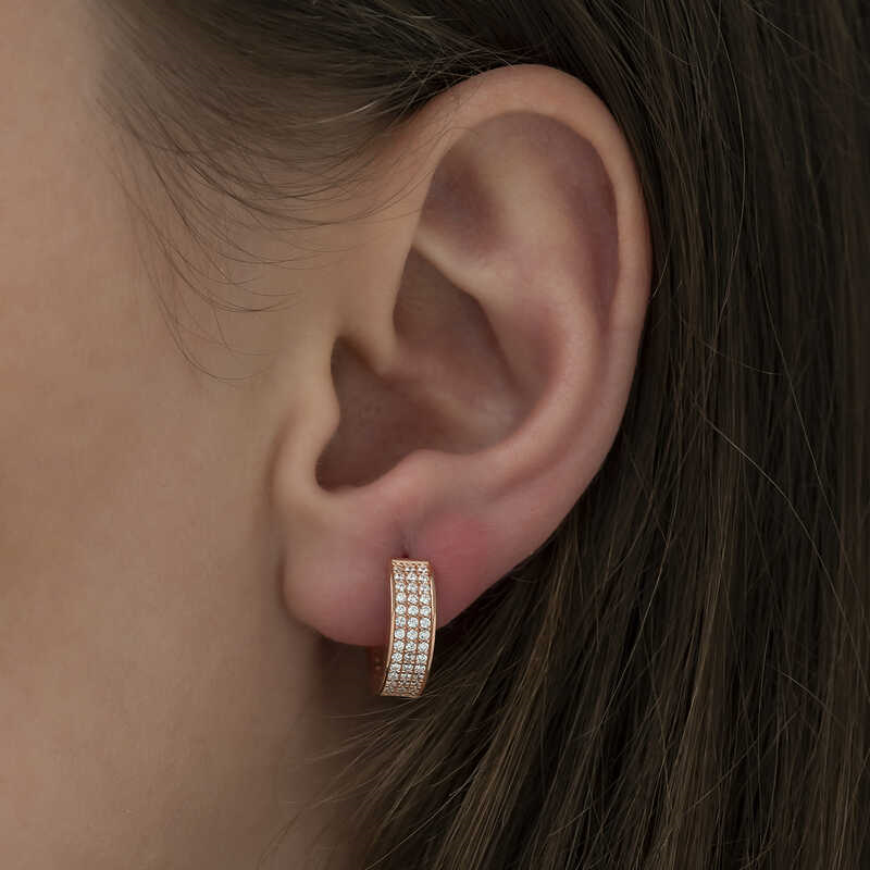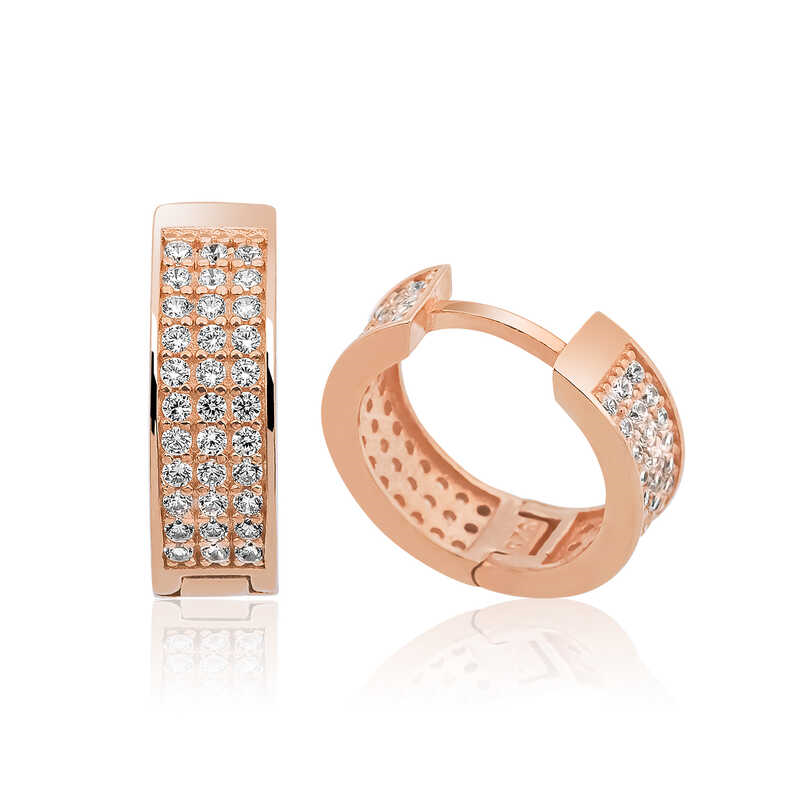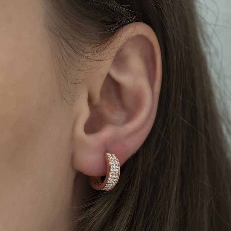 Silver Rose Row Stone Hoop EarringsThe gold row stone hoop earrings, created with minimal fine lines that you can use in every aspect of life, are waiting for you to add sparkle and elegance to your outfits. Different trendy designs are released every year. This year's most popular models stand out as multi-stone products. You can add these stylish earrings to your jewelry box or consider them as a gift for a loved one. The stylish zircon stone hoop earrings are made of 925 sterling silver. Rose gold plated over silver. Rose gold plated silver earrings preserve their shine for a long time and oxidation is delayed. The stones on them are zircon. Like all women's silver products, the silver rose row stone hoop earrings are produced by hand. Due to silver and precious stones, there may be a ± 10% deviation in the average product weight.Earring Thickness: 0.50 cmEarring Diameter: 1.50 cmAverage Weight: 3.77 gr.