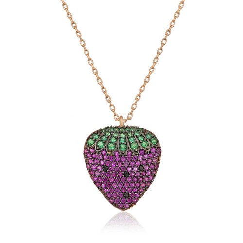 Silver Rose Strawberry Women's Necklace If you are one of the most popular fruits of the summer months, this time this time it meets with you in a silver necklace design. You can gift the silver strawberry necklace to your lover or all your loved ones on your birthday, anniversary, New Year's Day and Valentine's Day. Rose gold plated on silver. Rose gold plated silver women's necklaces preserve their shine for a long time and oxidation is delayed. Rose gold plating gives silver its copper color. Like all women's silver necklaces, the silver strawberry necklace is produced by hand. Due to silver and precious stones, there may be a ± 10% deviation in the specified product weight. Width: 1.50 cm Length: 1.70 cm Weight: 3.00 gr.
