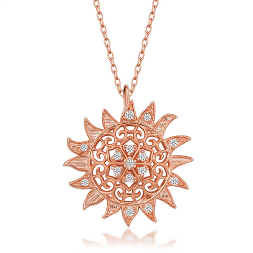 Silver Rose Sun Women's Necklace The sun is the symbol of light, knowledge, goodness, power, and management. This dazzling necklace with its sparkling and distinctive design is made of 925 sterling silver. Rose plating is applied to the silver. Rose-plated silver products preserve their shine for a long time and oxidation is delayed. The stones on the silver white stone sun women's necklace are zircon. Like all silver necklaces, the silver sun women's necklace is entirely handmade. Due to silver and precious stones, there may be a ± 10% deviation in the average product weight. Width: 1.70 cm Length: 2.00 cm Average Weight: 2.20 gr.