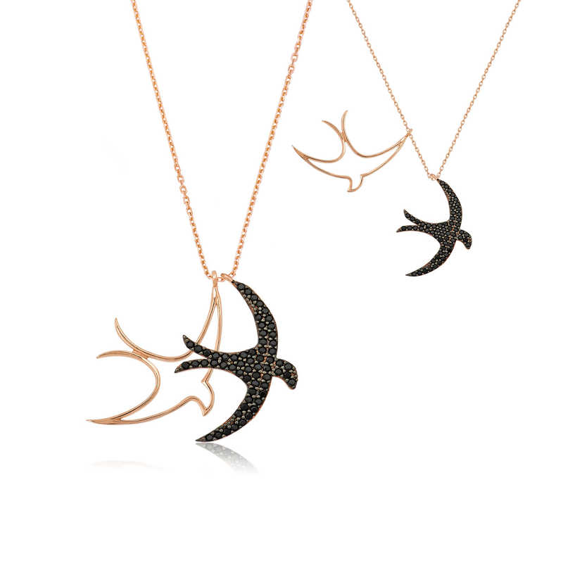 Silver Rose Swallow Pair Women's Necklace The swallow, one of the birds that has been on the lips of both poets and lovers for years with its beauty, deserves the praise of lovers also with the meanings it carries. The reason why the swallow is especially preferred by lovers is that it is a monogamous bird. The swallow figure, which also embodies loyalty and familial elements, is also described as the symbol of freedom. You can gift your loved ones the double swallow pair women's necklace, which is a symbol of love, and make them happy. The silver swallow pair women's necklace, one without stones and the other adorned with black zircon stones, is a wonderful model that you can enjoy and gift to your loved ones. The silver swallow pair women's necklace is made of 925 sterling silver. Rose gold plated silver women's necklaces preserve their shine for a long time and oxidation is delayed. The average silver chain length is 45 cm. The stones on it are zircon. Like all our silver women's necklace models, the silver swallow pair women's necklace is also handmade. Due to silver and precious stones, there may be ± 10% deviation in product weight. Width: 2.00 cm Length: 2.70 cm Weight: 2.58 gr.