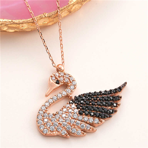 Silver Rose Swan Women's Necklace Swan represents lovers with its most noble, clear and elegant stance... This stylish and eye-catching necklace is a perfect option for a birthday gift, Valentine's Day gift or a gift for mothers on special occasions. The white stones on it are zircon. Swan necklace models are known as the symbol of delicacy and purity. This makes them a stylish gift option. The chain that comes with the necklace is completely silver and is 45 cm long. Rose plated on silver. Rose plated silver women's necklaces preserve their shine for a long time and oxidation is delayed. Like all silver women's necklace models, the silver women's swan necklace model is entirely handmade. For this reason, there may be ± 10% deviation in the average product weight due to mines and precious stones. Width: 2.50 cm Height: 2.00 cm Average Weight: 3.00 gr.