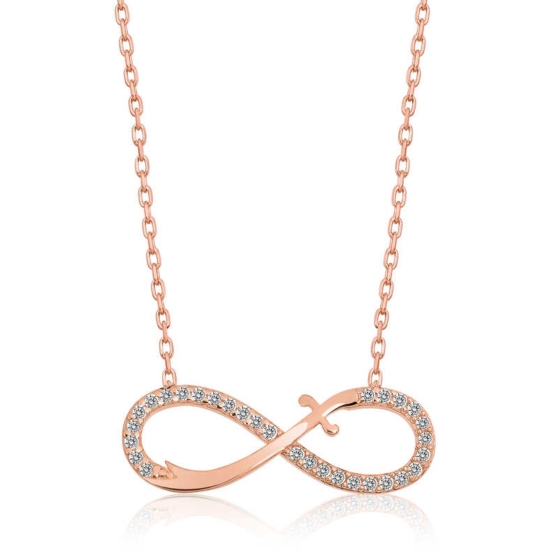 Silver Rose Sword Infinity Women's Necklace One of the most beautiful and meaningful ways to express your eternal love to your lover is with an infinity necklace. With this special necklace that you can gift to your lover and yourself, you can express your eternal love and affection for her/him and send the message that you will be together forever. This wonderful necklace design is made of 925 sterling silver. Rose gold plated on silver. Rose gold plated silver necklace models preserve their shine for a long time. The silver chain length of the necklace is 45 cm. This rose gold-plated silver infinity necklace is produced with labor. Due to silver and precious stones, there may be ± 10% deviation in the average product weight. Width: 1.60 cm Length: 1.80 cm Weight: 2.40 gr.