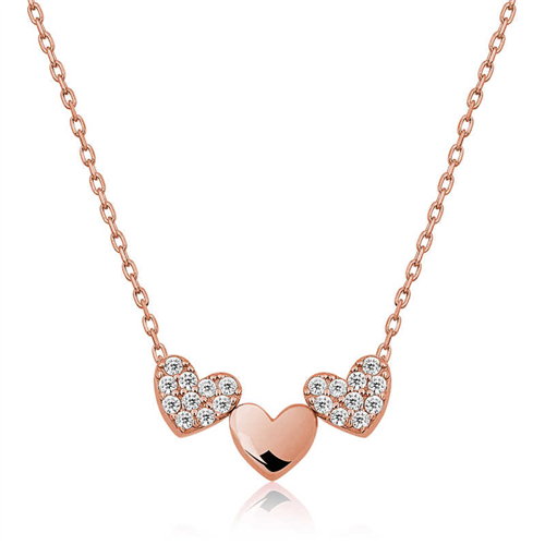 Silver Three Heart Women's Necklace The heart symbol has always been the symbol of unconditional love and passion. In religious teachings, the power of the heart is limitless. Because the heart is the house of the Creator and our gateway to reality that opens to the universe. The three heart necklace is one of the most stylish and meaningful necklaces that will represent your love. This stylish three heart necklace is a perfect option for a birthday gift, Valentine's Day gift or a gift for mothers on special occasions. Silver three heart women's necklace with zircon stones is made of 925 sterling silver. This necklace is rose plated. Rose plated silver women's necklace models preserve their shine for a long time. The sparkling stones on it are zircon. Like all silver women's necklace models, the silver three heart women's necklace model is produced by hand. Due to silver and precious stones, there may be ± 10% deviation in the average product weight. Width: 1.60 cm Length: 0.50 cm Average Weight: 1.70 gr Chain Length: 45.00 cm