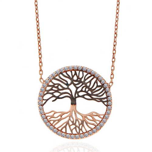 Silver Rose Tree of Life Women's Necklace The tree of life symbolizes new life. It also means leaving a mark on the world, continuing the lineage, in other words, the symbol of the family. This stylish necklace is made of 925 sterling silver. Rose plating is done on silver. Rose-plated products preserve their shine for a long time and delay oxidation. Like all silver women's necklaces, the silver tree of life women's necklace is handmade. Due to silver and precious stones, there may be a ± 10% deviation in the specified product weight. Necklace Diameter: 2.00 cm Chain Length: 45 cm Average Weight: 2.60 gr