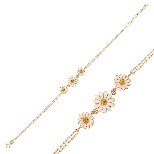 Silver Rose Triple Daisy Bracelet Daisy flower expresses the meaning of pure love. One of its most important features is that there is one on each stem. This sparkling bracelet, designed with this beauty, is adorned with zircon stones. This stylish bracelet is a perfect option for a birthday gift, Valentine's Day gift or a gift for mothers on special occasions. Silver triple daisy women's bracelet is made of 925 sterling silver. This bracelet is plated with rose gold. Rose gold-plated products preserve their shine for a long time. The stones on it are zircon. As with all silver women's bracelet models, the silver triple daisy women's bracelet model is also handmade. The length of the bracelet is 19 cm. There may be ± 10% deviation in the average product weight due to silver and precious stones. Width: 1.20 cm Length: 3.50 cm Avg. Weight: 2.35 gr.