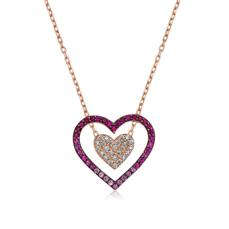 Silver Rose Two Hearts Women's Necklace The heart symbol has always been the symbol of unconditional love and passion. In religious teachings, the power of the heart is limitless. Because the heart is the house of the Creator and our gateway to reality that opens to the universe. Two hearts necklaces will represent you and your loved one. This stylish two heart necklace is a perfect option for a birthday gift, Valentine's Day gift or a gift for mothers on special occasions. Silver two heart women's necklaces are made of 925 sterling silver. Rose plated. Rose plated silver women's necklaces preserve their shine for a long time, turning the silver color into pink. The sparkling stones on them are zircon. As with all our silver women's necklace models, the silver two heart women's necklace is produced by hand. Due to silver and precious stones, there may be a ± 10% deviation in the average product weight. Width: 1.70 cm Length: 1.60 cm Average Weight: 2.18 gr. Chain Length: 45 cm.