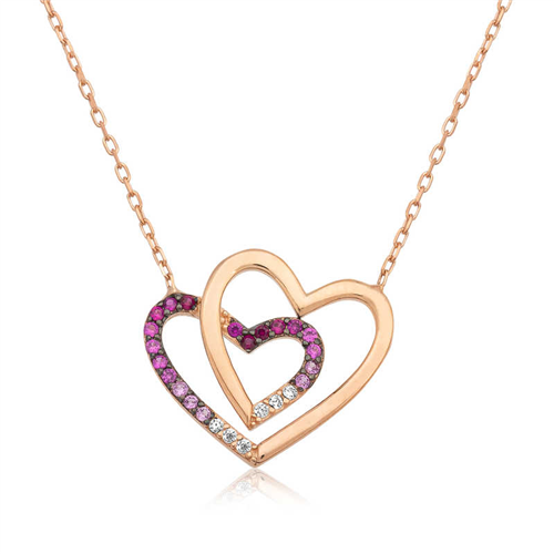 Silver Rose Two Hearts Women's Necklace The heart symbol has always been the symbol of unconditional love and passion. In religious teachings, the power of the heart is limitless. Because the heart is the house of the Creator and our gateway to reality that opens to the universe. Two hearts necklaces will represent you and your loved one. This stylish two heart necklace is a perfect option for a birthday gift, Valentine's Day gift or a gift for mothers on special occasions. Silver two heart women's necklaces are made of 925 sterling silver. Rose plated. Rose plated silver women's necklaces preserve their shine for a long time, turning the silver color into pink. The sparkling stones on them are zircon. As with all our silver women's necklace models, the silver two heart women's necklace is produced by hand. Due to silver and precious stones, there may be a ± 10% deviation in the average product weight. Width: 1.80 cm Length: 1.60 cm Average Weight: 1.80 gr. Chain Length: 45 cm.