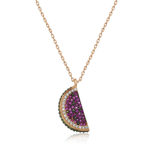 Silver Rose Watermelon Slice Necklace If you are one of the most popular fruits of the summer months, this time it meets with you in a silver necklace design. You can gift the silver watermelon slice necklace to your lover or all your loved ones on your birthday, anniversary, New Year's Day and Valentine's Day. Rose gold plated on silver. Rose gold plated silver women's necklaces preserve their shine for a long time and oxidation is delayed. Rose gold plating gives silver a copper color. Like all women's silver necklaces, the silver watermelon slice necklace is also handmade. Due to silver and precious stones, there may be a ± 10% deviation in the specified product weight. Width: 1.00 cm Length: 1.50 cm Average Weight: 2.46 gr.