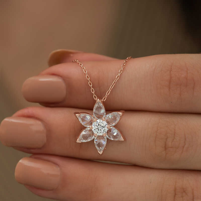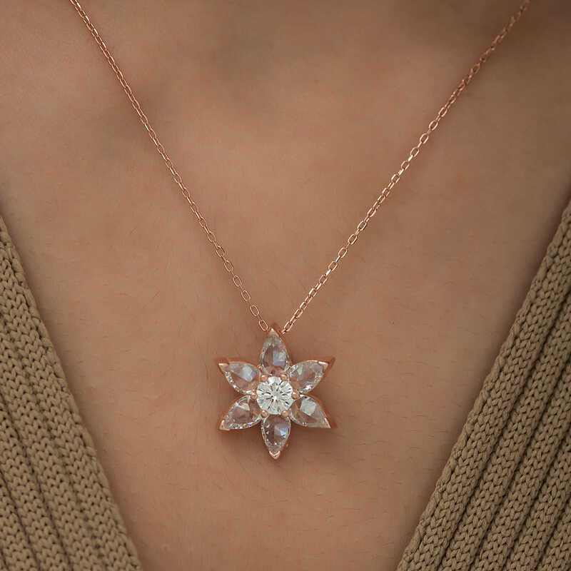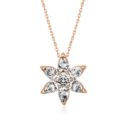 Silver Rose White Flower Necklace Why not express your feelings to your loved ones with an elegant floral patterned necklace? This stylish necklace, which is among the gift options that you can send to her on special occasions, is among the best ways to make your loved ones happy. Silver white flower women's necklace crafted with the highest quality and most sparkling stones is waiting for those who want to express their love once again, for those who want to say "you are a flower." This specially designed silver white flower women's necklace is made of 925 sterling silver. Rose plating is applied on the silver. Rose-plated silver women's necklace models preserve their shine for a long time and oxidation is delayed. The average silver chain length is 45 cm. Like all women's silver necklace models, the silver white flower necklace is also handmade. Due to silver and precious stones, there may be a ± 10% deviation in the specified product weight. Width: 1.60 cm Length: 1.60 cm Average Weight: 4.00 gr.
