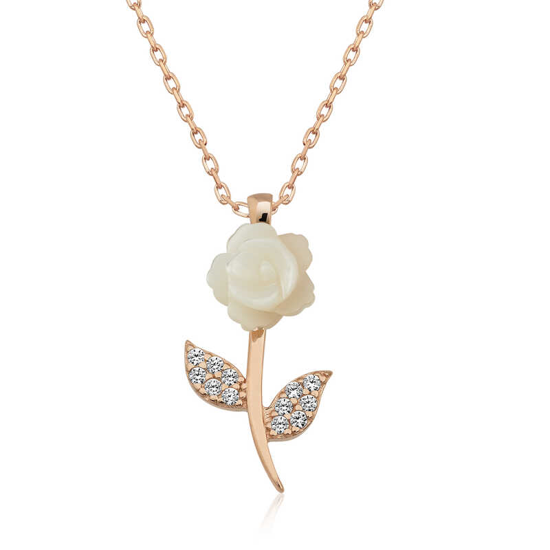 Silver Rose White Rose Necklace White roses have been seen in different cultures throughout history and carried religious or political symbols. The rose has inspired poems and paintings throughout history. Moreover, the white rose has been the symbol of innocence of love and is best known for this. You can gift a silver white rose necklace to your loved one to express your love and make them feel your love on their skin. This stylish necklace is a perfect option for a birthday gift, Valentine's Day or special occasions. The necklace is made of 925 sterling silver. Rose plating is applied to silver. Rose plating gives the silver a pink copper color. Like other necklaces, the silver white rose necklace is produced by hand. Due to silver and precious stones, there may be a ± 10% deviation in the average product weight. Width: 1.00 cm. Length: 2.00 cm. Average Weight: 2.00 gr.