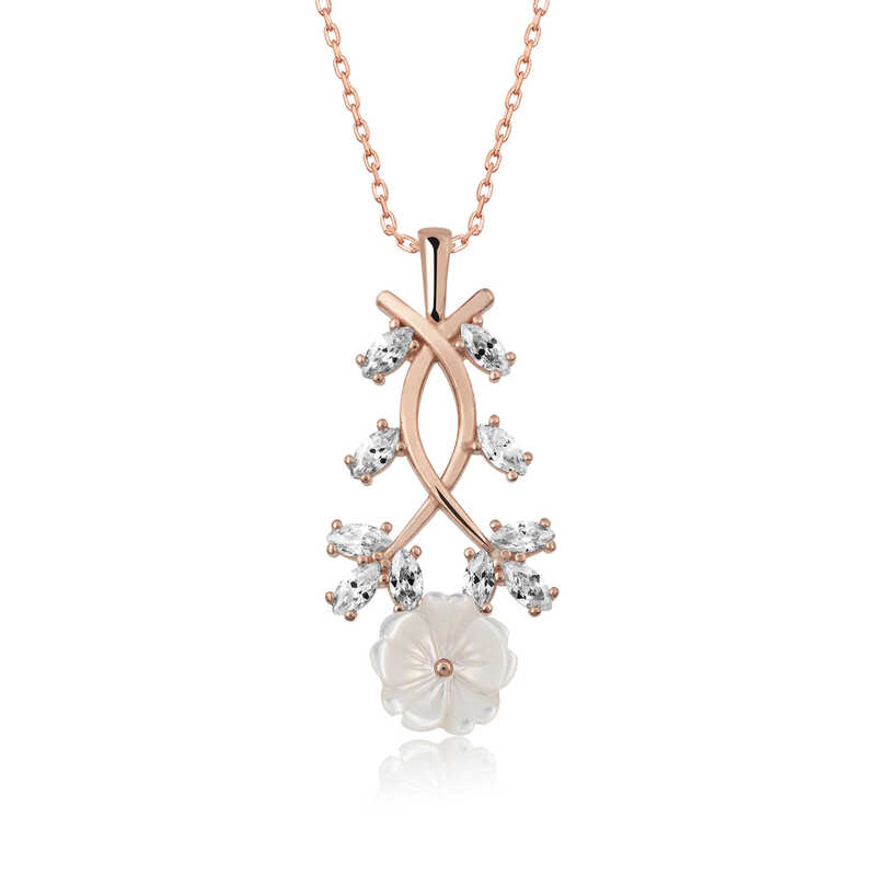 Silver Rose White Spring Flower Necklace With the warming of the weather, nature, coming to life, heralds the arrival of spring. Trees covered in green, colorful flowers bloom and welcome us with their unique scents. Inspired by nature, this necklace symbolizes the rebirth of spring. This stylish necklace is a perfect option for a birthday gift, Valentine's Day or special occasions. The necklace is made of 925 sterling silver. Rose plated on silver. Like other necklaces, the silver white spring flower necklace is also handmade. Due to silver and precious stones, there may be ± 10% deviation from the average product weight. Width: 1.50 cm Length: 2.00 cm Avg. Weight: 2.85 gr.