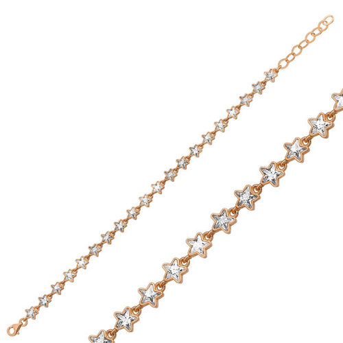 Silver Rose White Star Women's BraceletThe star is an auspicious symbol believed to bring luck in many societies and teachings. It carries the energy of the Planet Venus. The Planet Venus is also the representative of the energy of love and romance. This stylish bracelet consisting of white stars is a perfect option for a birthday gift, Valentine's Day gift or on special occasions. Silver rose white star women's bracelet is made of 925 sterling silver. This bracelet has rose plating. Rose plated silver women's bracelet models preserve their shine for a long time, turning the silver into a pink color. As with all our silver women's bracelet models, the silver rose white star women's bracelet model is also handmade. Due to silver and precious stones, there may be a ± 10% deviation in the average product weight. Width: 0.60 cm Length: 20.00 cm Avg. Weight: 8.35 gr.