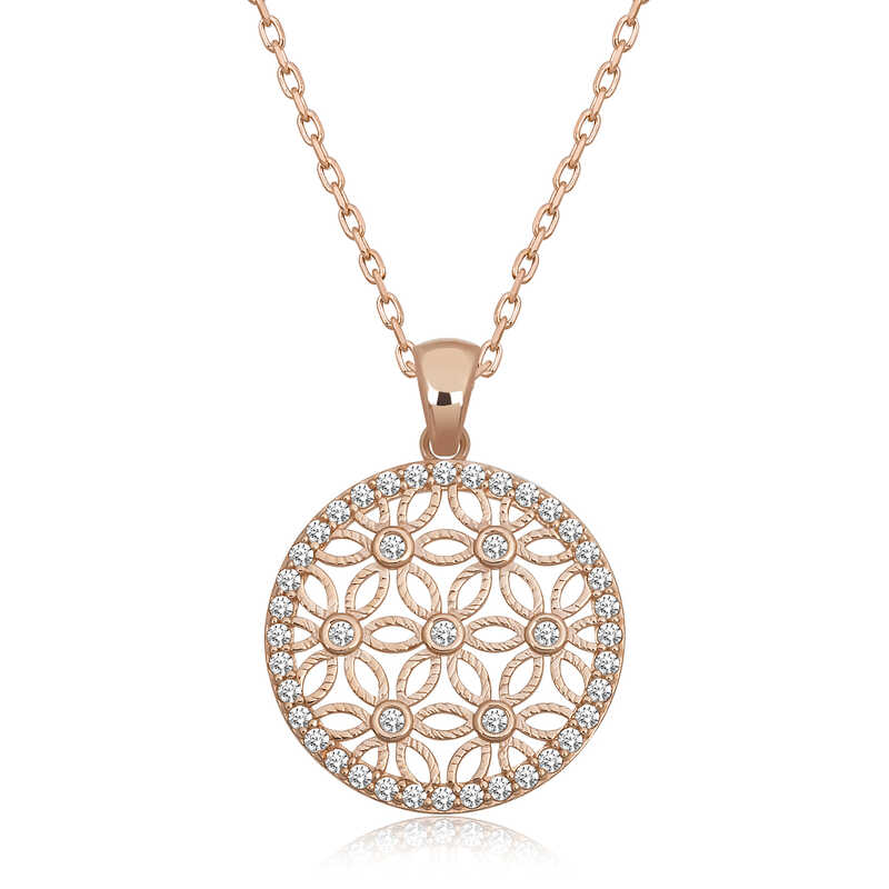 Silver Rose White Stone Flower of Life Women's NecklaceThe flower of life is the only geometric shape that contains all the secrets and knowledge of creation. In reality, it is not a circle but a sphere. It should be thought of as three-dimensional or even multi-dimensional. The flower of life contains Plato's 5 solids and Metatron's cube. These shapes construct all of existence. Considered one of the most powerful and special symbols in ancient teachings, the flower of life is the essence of the power of eternity, perfection, and excellence. You can delight your loved ones or yourself with this special necklace. The flower of life women's necklace model is made of 925 sterling silver. Rose plated silver. Rose plated silver women's necklace models preserve their shine for a long time and oxidation is delayed. The stones on the necklace are zircon. The average silver chain length is 45 cm. This flower of life women's necklace model is handmade like other silver women's necklace models. Due to silver and precious stones, there may be a ± 10% deviation in the average product weight.Width: 1.80 cmLength: 2.50 cmAverage Weight: 3.50 gr.