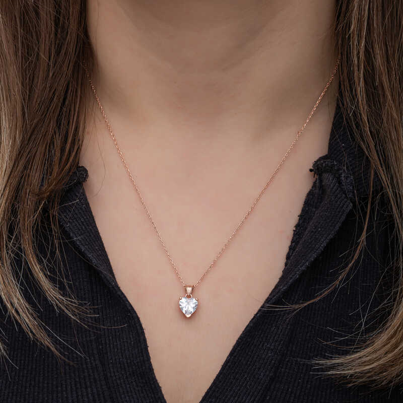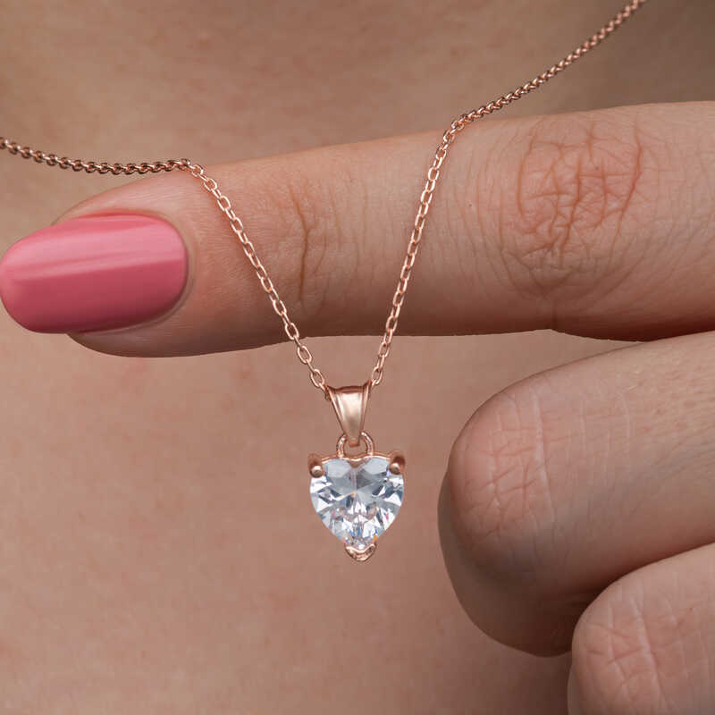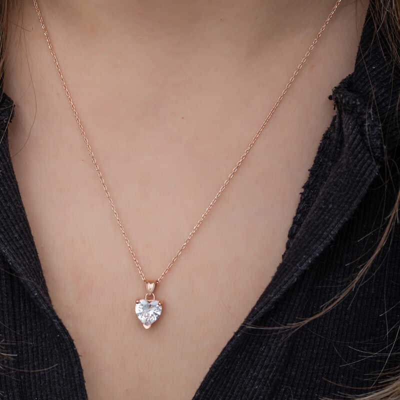 Silver Rose White Stone Heart Women's Necklace Let your love come to life on the skin of the woman you love with the heart necklace model that expresses love with its heart pattern. Adorn your loved one with love with this heart women's necklace that young lovers and those who feel young can choose on special occasions. A heart patterned necklace that your loved ones will enjoy wearing as much as you do will be one of the best gifts for your loved one. The heart women's necklace is made of 925 sterling silver. Rose plated silver. Rose plated silver women's heart necklaces preserve their shine for a long time and oxidation is delayed. The stone on the necklace is zircon. The average silver chain length is 50 cm. Like all women's necklaces, the silver and white stone heart women's necklace is also handmade. Due to silver and precious stones, there may be a ± 10% deviation in the average product weight. Necklace Width: 0.90 cm Necklace Length: 1.10 cm Chain Length: 50 cm Average Weight: 2.90 gr