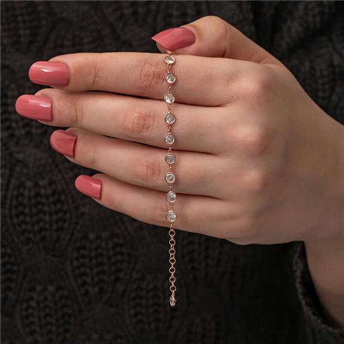 Silver Rose White Stone Women's Bracelet Anklet models with colored stones, which stand out among the popular jewelry of recent times, are frequently preferred especially in the summer months. Jewelry enriched with different elegant nuances, leave an extremely noble and stylish stance on your wrist. Bracelets that can be used with both evening and daily outfits help complete your elegance. The white stone anklet trend allows you to be noticed with your noble stance on special occasions. To add a brand new touch to your jewelry style or to offer your loved ones a beautiful gift that they will never forget, you can make a nice selection by taking a look at our innovative bracelet models. The product will be sent in a gift box. This bracelet has rose plating. Rose plated products preserve their shine for a long time and delay oxidation. All of our products are handmade. Due to silver and precious stones, there may be a ± 10% deviation in product weight. Width: 0.40 mm Bracelet Length: 21 cm Average Weight: 3.30 gr.