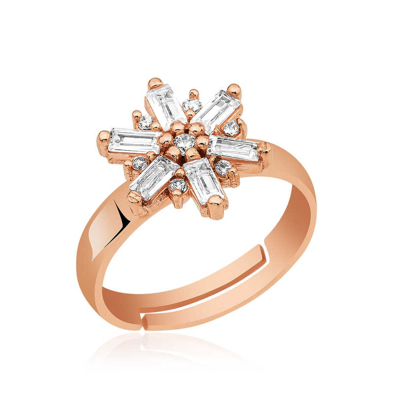 Silver Rose Wind Rose RingOne of the accessories that stand out with its unusual design and elegance, the wind rose ring adorned with baguette and zircon stones, will impress you with its 360 ° rotation feature. Inspired by nature, this stylish ring is an unusual accessory that you can gift to your loved ones. Wind rose flower ring is made of 925 sterling silver. Rose plated on silver. The ring is adjustable according to finger thickness. Like other rings, the silver adjustable rose wind rose ring is also handmade. Due to silver and precious stones, there may be ± 10% deviation from the average product weight.Width: 1.30 cmLength: 1.30 cmAvg. Weight: 3.10 gr.