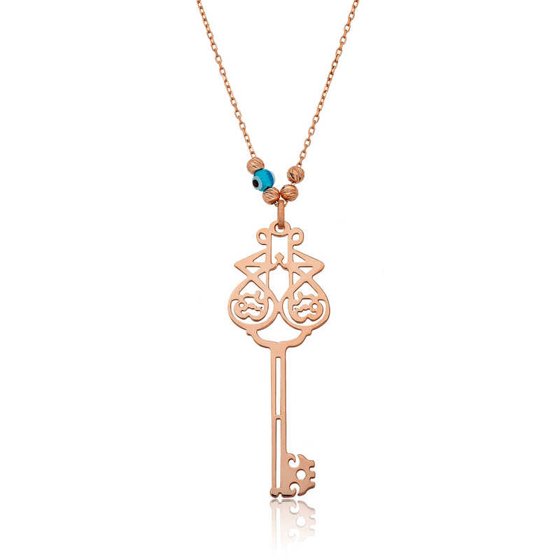 Silver Rose Ya Fettah Inscribed Women's Necklace Ya Fettah is one of the most beautiful names of Allah. It has meanings such as the one who rules, the one who opens doors and helps, the one who grants victory and conquest, and the one who clothes beings in forms. Creative models are waiting for you for your loved one or for yourself. Rose plating is made on silver. Rose-plated silver women's necklace models preserve their shine for a long time and delay oxidation. The average silver chain length is 45 cm. Like all silver women's necklace models, the silver Ya Fettah inscribed women's necklace model is produced by hand. Due to silver and precious stones, there may be a ± 10% deviation in the average product weight. Width: 1.70 cm Length: 4.60 cm Average Weight: 2.90 gr.